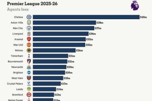 切爾西在本賽季支付了6510萬英鎊的經(jīng)紀(jì)人費用,連續(xù)第三個賽季領(lǐng)跑俱樂部榜單。2025-26賽季,切爾西占到了英格蘭足球聯(lián)賽92家俱樂部經(jīng)紀(jì)人總支出的12%。