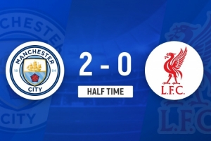 傷停補時2分鐘。上半場比賽結束,曼城2-0利物浦。