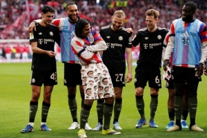 體育資訊4月5日訊 拜仁在本輪德甲3-2逆轉(zhuǎn)絕殺弗賴堡,拜仁球員在賽后照例進(jìn)行了慶祝。