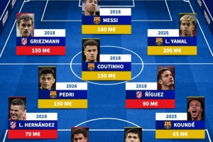 前鋒:格列茲曼(1.5億歐,2018年)、梅西(1.8億歐,2018年)、亞馬爾(2億歐,2025年)