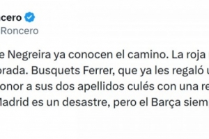《阿斯報(bào)》主編、皇馬球迷龍賽羅社媒寫道:“內(nèi)格雷拉的繼承者們已經(jīng)摸清了門道。這是本賽季至今最明顯的紅牌。布斯克茨·費(fèi)雷爾——這位已經(jīng)在巴列卡斯送給過他們一個(gè)點(diǎn)球的裁判——用一次可恥的改判,完美地印證了他的兩個(gè)帶有巴薩色彩的姓氏,皇馬表現(xiàn)確實(shí)糟糕,但巴薩永遠(yuǎn)是12人作戰(zhàn)?!?/p>