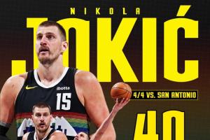 近7場5次砍下大三雙約基奇轟40分8板13助0失誤創(chuàng)中鋒歷史紀錄