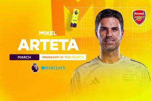 而在4月3日,阿爾特塔收獲了英超3月最佳主帥,擊敗了埃迪·豪、赫爾澤勒、勒布里斯和莫耶斯。