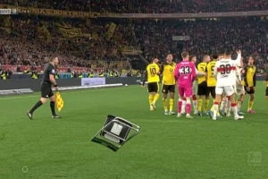多名斯圖加特極端球迷翻越圍欄,沖入內(nèi)場(chǎng)區(qū)域,甚至來(lái)到了電視轉(zhuǎn)播席旁,距離球員僅有幾米遠(yuǎn)。從背景中可以看到,一把折疊椅朝著多特蒙德球員的方向飛來(lái)。這把椅子顯然屬于坐在球門(mén)后方區(qū)域的攝影師,此后比賽隨即結(jié)束。