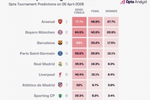 Opta預(yù)測晉級歐冠四強(qiáng)概率:槍手77.7%最高,巴薩68%、拜仁64.5%