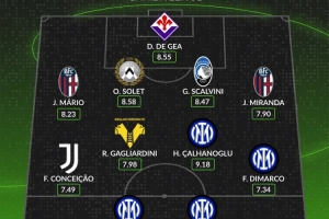 中場(chǎng):孔塞桑(尤文圖斯,7.49分)、加利亞爾迪尼(維羅納,7.98分)、恰爾汗奧盧(國際米蘭,9.18分)、迪馬爾科(國際米蘭,7.34分)
