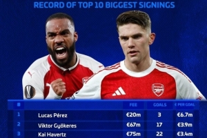 德轉(zhuǎn)列阿森納隊(duì)史每進(jìn)1球花費(fèi)最貴前鋒:歐元(僅考慮作為中鋒或影鋒時(shí)的比賽)