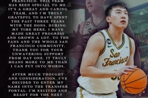 王俊杰寫道:“首先,我想感謝舊金山大學(xué)的教練和隊友們。這支球隊對我來說意義非凡,這是一個充滿關(guān)懷的偉大團(tuán)隊。我非常感激過去三年能夠與多恩隊共度時光。在這里的日子里,我取得了很大的進(jìn)步,也成長了許多。對于球迷和整個舊金山社區(qū),從第一天起你們就給予了我堅定不移的支持,這對我來說意義重大,難以言表。