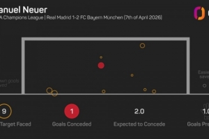 拜仁門將諾伊爾本場比賽做出9次撲救,他是有相關(guān)統(tǒng)計(jì)以來,首位在客戰(zhàn)皇馬的歐冠淘汰賽中做出9次撲救的門將。