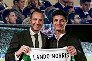 歐冠1/4決賽首回合,葡體主場0-1不敵阿森納,F(xiàn)1世界冠軍、邁凱倫車手諾里斯現(xiàn)場觀戰(zhàn),與他一同觀戰(zhàn)的還有前女友科爾塞羅,諾里斯同時(shí)獲贈(zèng)一件葡體4號球衣。