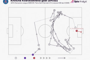 據(jù)統(tǒng)計(jì),克瓦拉茨赫利亞進(jìn)球前巴黎共完成27次連續(xù)傳球,在本賽季歐冠僅有3粒進(jìn)球比這次破門(mén)前傳球次數(shù)更多。