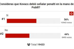 截至目前有19433人參與投票,56%的人認(rèn)為普比爾手球該被判點(diǎn)球,44%的人認(rèn)為不是點(diǎn)球。