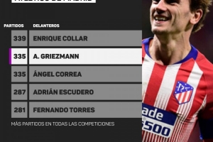 據(jù)Opta數(shù)據(jù)統(tǒng)計(jì),格里茲曼已追平安赫爾·科雷亞,335次出場(chǎng)并列成為馬德里競技?xì)v史上出場(chǎng)次數(shù)第二多的前鋒,目前僅次于恩里克·科拉爾的339場(chǎng)。