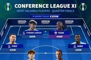體育資訊4月9日訊 德轉(zhuǎn)官網(wǎng)公布了本賽季歐協(xié)聯(lián)1/4決賽身價(jià)最高十一人陣容,英超水晶宮獨(dú)占九席。德轉(zhuǎn)對(duì)此陣容的解讀也十分簡(jiǎn)明扼要:“顯然,這就是水晶宮是本賽季歐協(xié)聯(lián)冠軍大熱門的原因?!?/p>