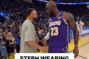詹姆斯和庫(kù)里賽前開(kāi)心寒暄 鏡頭給到庫(kù)里穿的詹姆斯10代簽名鞋