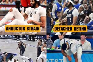 濃眉自被湖人交易至獨行俠后至今僅為獨行俠出戰(zhàn)了29場比賽,在這29場比賽內,他已遭遇了6處不同的傷病,分別是(按時間順序):內收肌拉傷、視網膜脫離、小腿挫傷、跟腱酸痛、腹股溝拉傷、左手韌帶損傷。