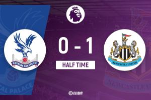 上半場傷停補(bǔ)時(shí)2分鐘,半場結(jié)束,水晶宮暫0-1紐卡斯?fàn)柭?lián)。
