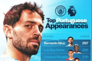B席英超297次出場創(chuàng)葡萄牙球員紀(jì)錄,C羅、B費(fèi)、若塔均在前五