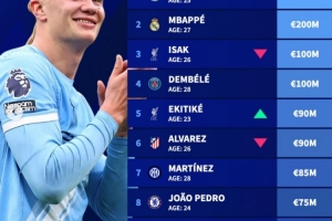 體育資訊4月13日訊 德轉(zhuǎn)更新了足壇中鋒身價(jià)情況,哈蘭德和姆巴佩均兩億歐,伊薩克、登貝萊均1億歐緊隨其后。