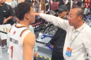 比賽結(jié)束后,場邊發(fā)生了一個(gè)小插曲,上海男籃球員李添榮想和場邊的球迷擊掌互動(dòng),但是遭到北京主場工作人員的攔截。