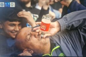 體育資訊04月13日訊 英超第32輪,曼城客場3-0完勝切爾西。比賽過程中轉(zhuǎn)播鏡頭對準(zhǔn)了看臺上的一位曼城球迷,他拿著印有阿森納標(biāo)志的水瓶瘋狂嘲諷慶祝,瞬間走紅。