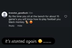 今日塞梅尼奧更新個人ins,曬出有人對自己種族歧視辱罵。該網(wǎng)友罵塞梅尼奧:當(dāng)你坐替補(bǔ)席15場比賽后,你就知道怎么踢球了,你這只黑猴子。