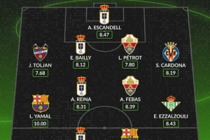體育資訊4月14日訊 西甲第31輪戰(zhàn)罷,數(shù)據(jù)網(wǎng)站W(wǎng)hoscored也評選出本輪比賽評分最高陣容,其中亞馬爾滿分10分領(lǐng)銜,具體如下: