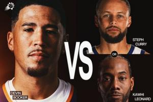 并且,因?yàn)樘?yáng)排名高,主場(chǎng)能多賣一場(chǎng)票,太陽(yáng)官方也曬出了宣傳海報(bào),主人公是布克、庫(kù)里、倫納德。