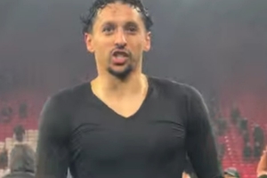 巴黎隊(duì)長(zhǎng)馬爾基尼奧斯賽后與球迷互動(dòng),面對(duì)熱情的球迷,已經(jīng)送出球衣的他脫下球褲扔向看臺(tái)。