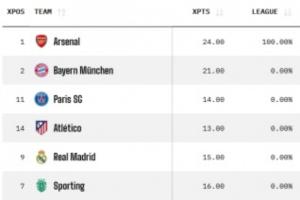 歐冠奪冠概率:阿森納34%居首,拜仁巴黎馬競分列2-4,皇馬僅3%