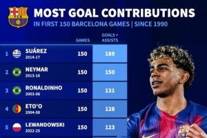 巴薩生涯歐冠前150場參與進(jìn)球榜:蘇牙189球居首 亞馬爾100球第十