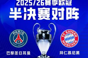 歐冠半決賽兩回合對(duì)陣將于北京時(shí)間4月29日、5月6日進(jìn)行;巴黎先主后客,拜仁先客后主。