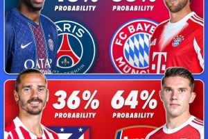 Score 90對4隊晉級決賽的概率進(jìn)行了預(yù)測,拜仁55%,巴黎圣日耳曼45%,阿森納64%,馬競36%。