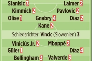 體育資訊4月16日訊 拜仁在本輪歐冠主場(chǎng)4-3再勝皇馬,《圖片報(bào)》按照慣例進(jìn)行了賽后評(píng)分??R文加獲得了超出常規(guī)范疇的6分(代表超級(jí)糟糕的表現(xiàn))。