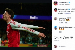 阿森納球員哈弗茨社媒曬出慶祝的照片,配文:“半決賽我們來了,迎接一個(gè)重要的周末?!?/p>