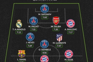 體育資訊4月16日訊 歐冠八強(qiáng)戰(zhàn)已經(jīng)完賽,whoscored也列出了本輪評分最佳陣容,巴黎4將、拜仁3人。