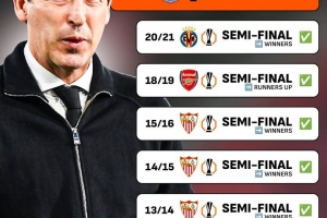 執(zhí)教以來,維拉主帥埃梅里已經(jīng)7次闖進(jìn)歐聯(lián)杯半決賽,他本賽季有望奪得第5個歐聯(lián)杯冠軍。除了率領(lǐng)維拉闖進(jìn)歐聯(lián)杯半決賽外,埃梅里還曾率領(lǐng)瓦倫西亞、塞維利亞(3次)、阿森納以及比利亞雷亞爾闖進(jìn)歐聯(lián)杯半決賽。