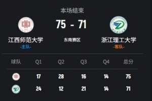 末節(jié)之爭浙江理工再接再厲,蘇靖妍開局率先拿分,鮑一諾隨后外線開火命中三分,浙江理工送上7-2的攻勢反超比分。不過關(guān)鍵時刻江西師大及時作出回應(yīng),嚴(yán)喜平連拿4分奪回領(lǐng)先,許嵐清則再外線命中三分,江西師大重新建立起5分優(yōu)勢奠定勝局,最后時刻歐智利的進(jìn)球幫助浙江理工追至2分但為時已晚。最終,江西師范大學(xué)75-71擊敗浙江理工大學(xué)拿下比賽。