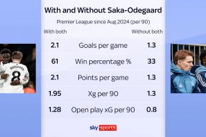 天空體育數(shù)據(jù)統(tǒng)計(jì)顯示,自2024年8月以來,當(dāng)薩卡和厄德高同時(shí)出戰(zhàn)時(shí),阿森納英超場均打進(jìn)2.1球、勝率61%、場均2.1分、預(yù)期進(jìn)球值1.95、運(yùn)動戰(zhàn)預(yù)期進(jìn)球值1.28。