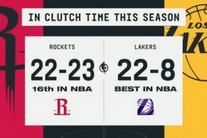 據(jù)統(tǒng)計,本賽季常規(guī)賽湖人關(guān)鍵時刻戰(zhàn)績?yōu)?2勝8負,排名聯(lián)盟第一;火箭關(guān)鍵時刻戰(zhàn)績?yōu)?2勝23負,排名聯(lián)盟第16。