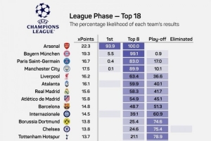 體育資訊1月20日訊 opta預(yù)測了本賽季歐冠聯(lián)賽階段的預(yù)期積分,以及直接晉級前八和參加附加賽的概率。阿森納將93.9%獲得聯(lián)賽階段頭名,拜仁僅5.5%概率獲得頭名。