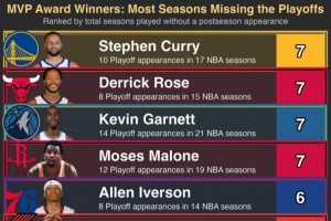 前MVP球員生涯無緣季后賽次數(shù)歷史排名: