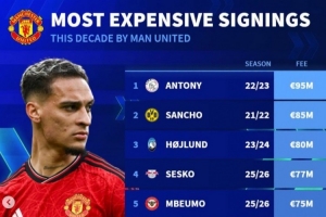 體育資訊4月19日訊 《轉(zhuǎn)會(huì)市場(chǎng)》統(tǒng)計(jì)了曼聯(lián)自2020年以來(lái)的最貴引援情況,B費(fèi)僅位列第9位。