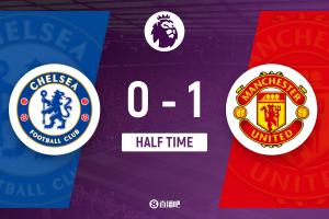 上半場傷停補(bǔ)時(shí)5分鐘,半場結(jié)束,切爾西暫0-1曼聯(lián)。