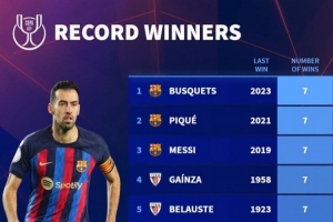 體育資訊4月19日訊 德國轉(zhuǎn)會(huì)市場統(tǒng)計(jì)了球員國王杯奪冠次數(shù),并列出榜單,布斯克茨、皮克、梅西等5名球員7冠居首,前10名中,有8名球員在巴薩奪得過國王杯冠軍。
