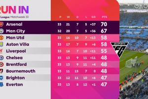 體育資訊04月20日訊 曼城本輪2-1擊敗阿森納,曼城少賽1場落后3分,阿森納凈勝球37,曼城36。