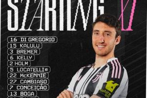 尤文首發(fā):16-迪格雷戈里奧、15-卡盧盧、3-布雷默、6-凱利、2-霍爾姆、5-洛卡特利、22-麥肯尼、27-坎比亞索、7-孔塞桑、13-博加、30-戴維