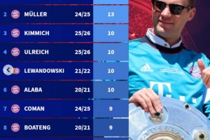 體育資訊4月20日訊 德甲第30輪比賽,拜仁以4-2的比分戰(zhàn)勝斯圖加特鎖定本賽季的德甲冠軍,諾伊爾、基米希、烏爾賴希等人再添一個(gè)德甲冠軍獎(jiǎng)牌。德國(guó)轉(zhuǎn)會(huì)市場(chǎng)盤(pán)點(diǎn)了球員德甲獲得德甲冠軍的數(shù)量,諾伊爾和穆勒均拿到13個(gè)德甲冠軍并列榜首,前10均為拜仁球員。