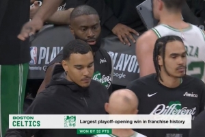 此役凱爾特人攻防兩端壓制對手,最終取得了32分的大勝,4節(jié)單節(jié)比分全部高于76人,也是隊史季后賽揭幕戰(zhàn)最大分差的勝利。