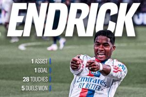 恩德里克上一次為里昂進球還要追溯到一個月前,他在歐聯(lián)杯1/8決賽首回合中為球隊打進絕平進球。此后,恩德里克的進球狀態(tài)不佳,被法國和西班牙媒體所詬病。如今他在對陣法甲榜首巴黎的比賽中再次證明了自己的實力。